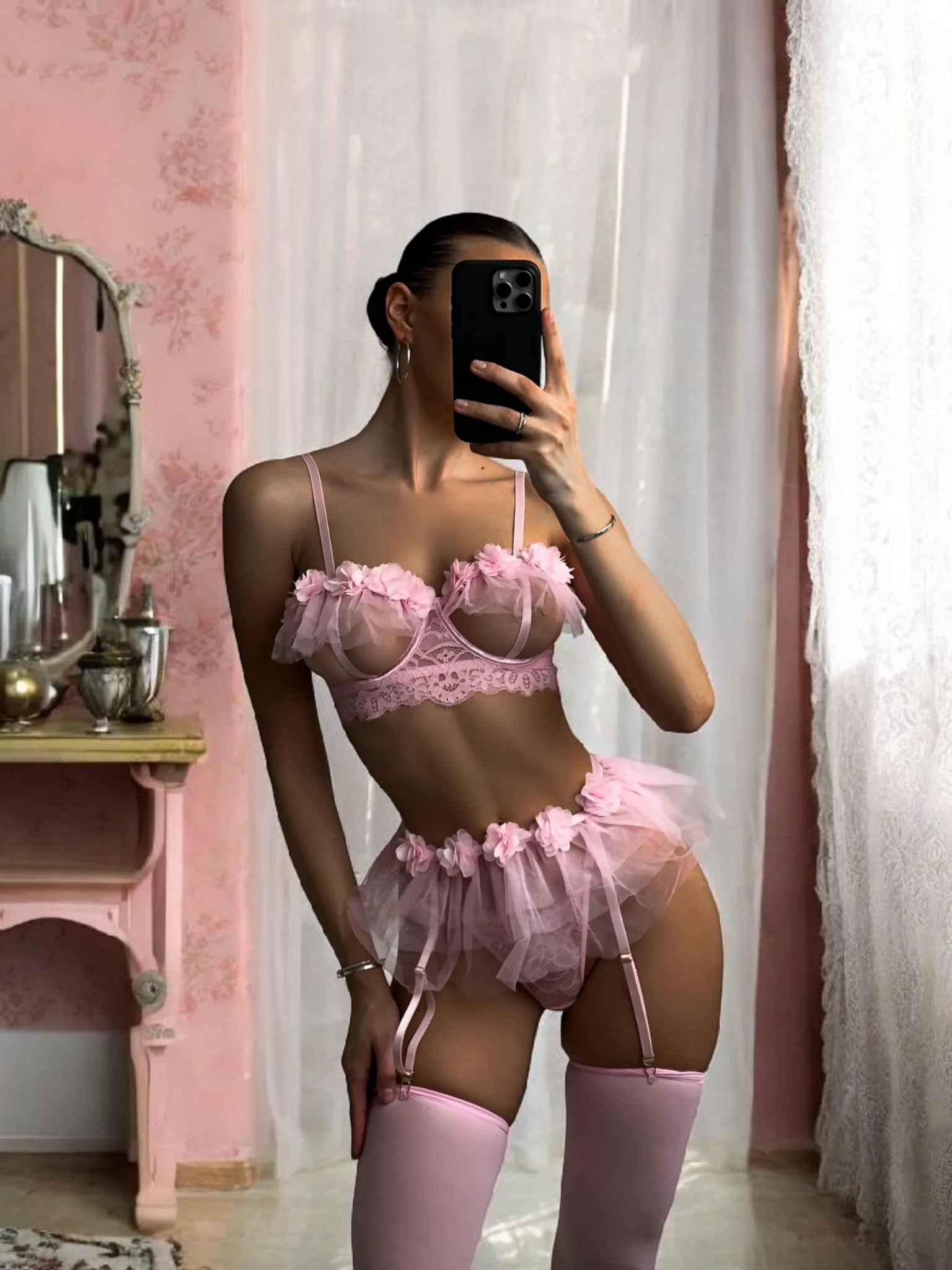 Un set féerique en tulle rose rehaussé de fleurs 3D et de dentelle délicate. Le soutien-gorge à armatures sublime le décolleté, la mini-jupe porte-jarretelles drape les hanches avec légèreté, et le string assorti complète une silhouette ultra-féminine, tendre et irrésistible.